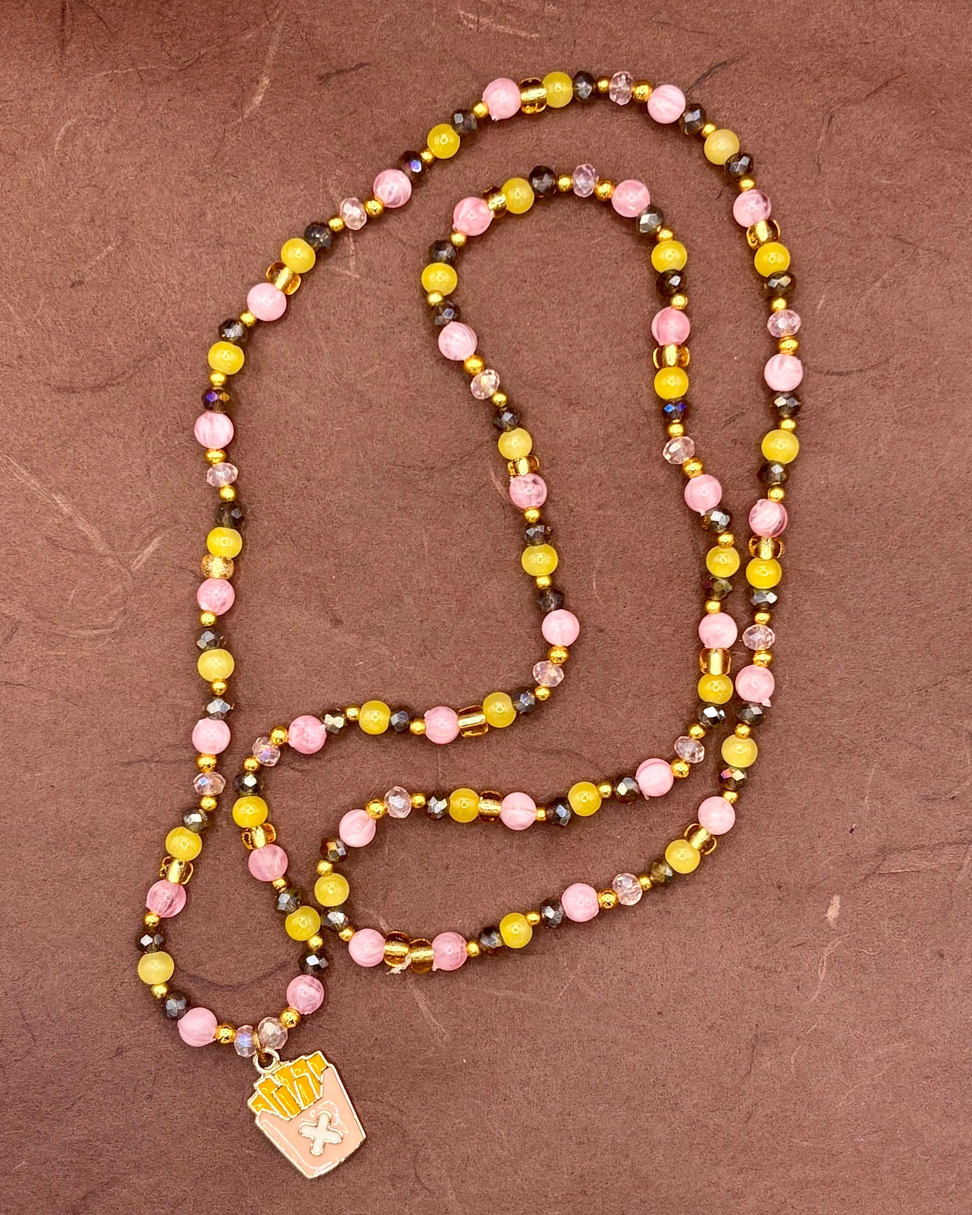 Materials: acrylic, glass and plastic beads, nylon string