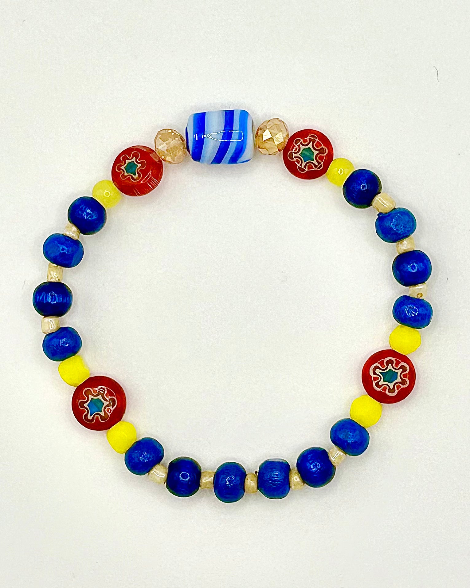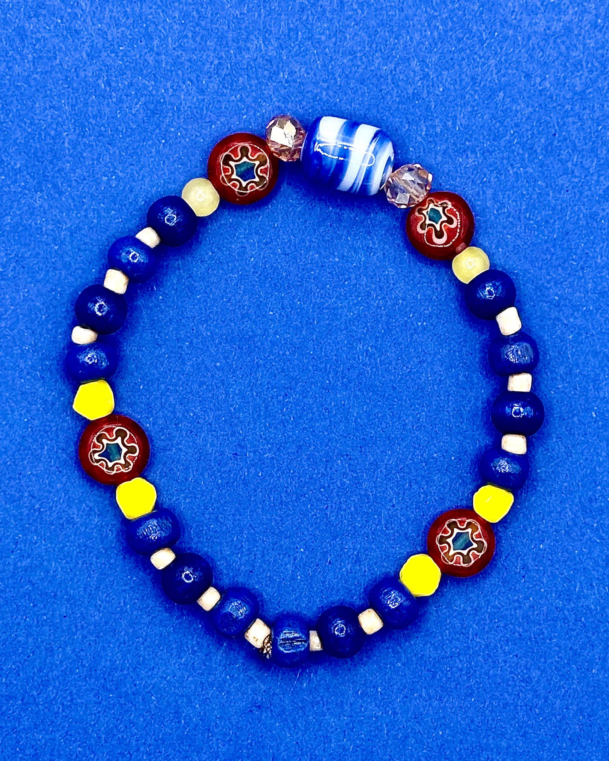 Materials: acrylic, wood and glass beads, elastic nylon thread