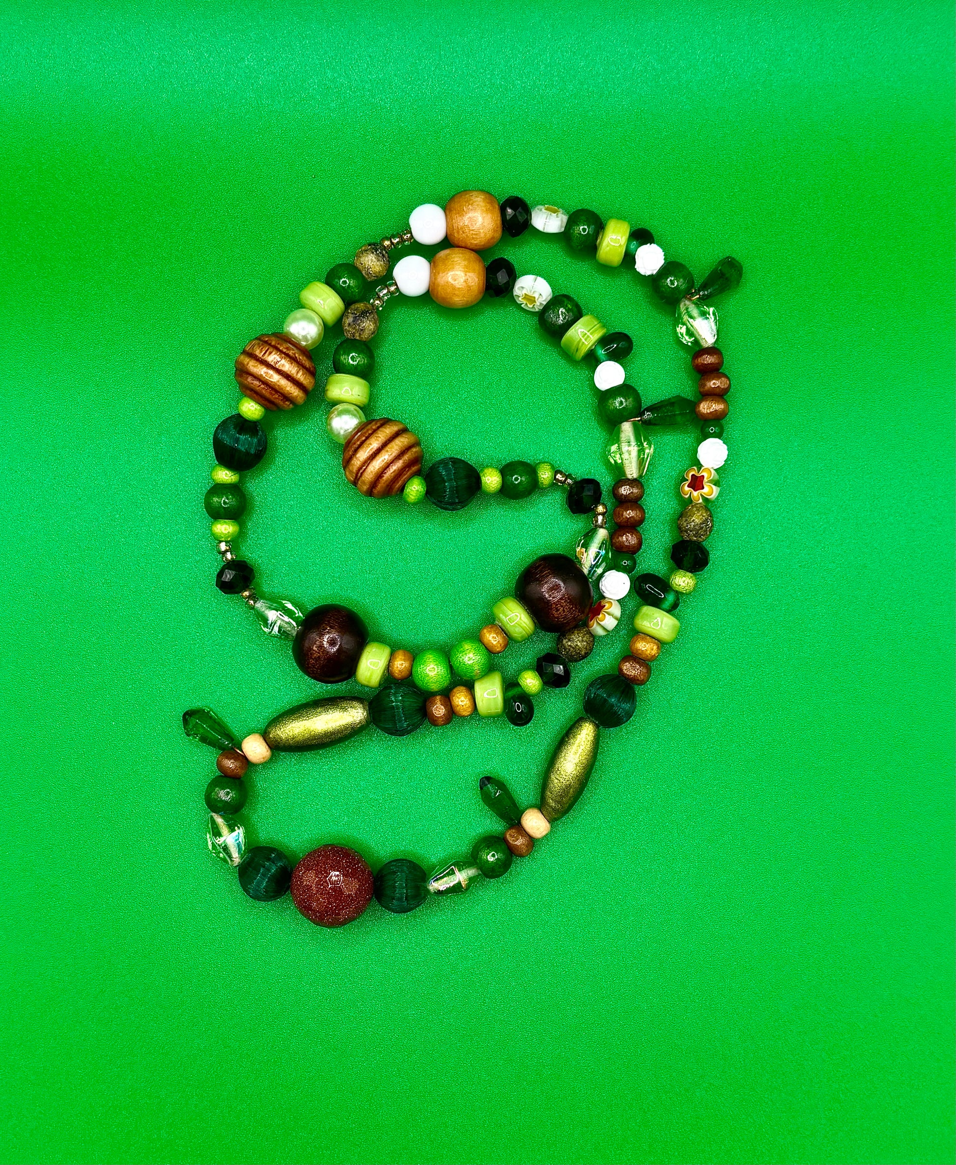 Materials: acrylic, wood and glass beads, nylon thread