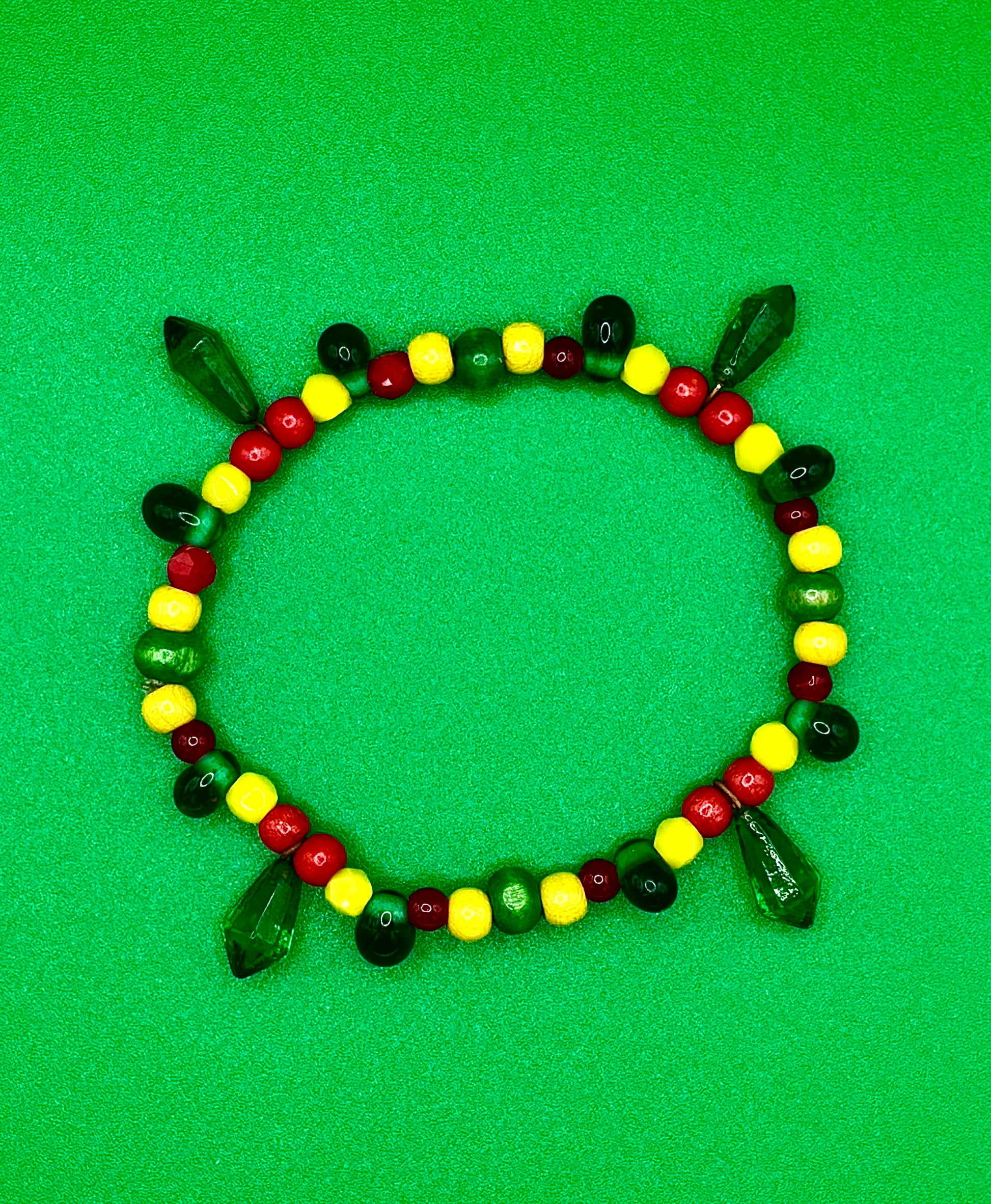 Materials: acrylic, wood and glass beads, elastic nylon thread