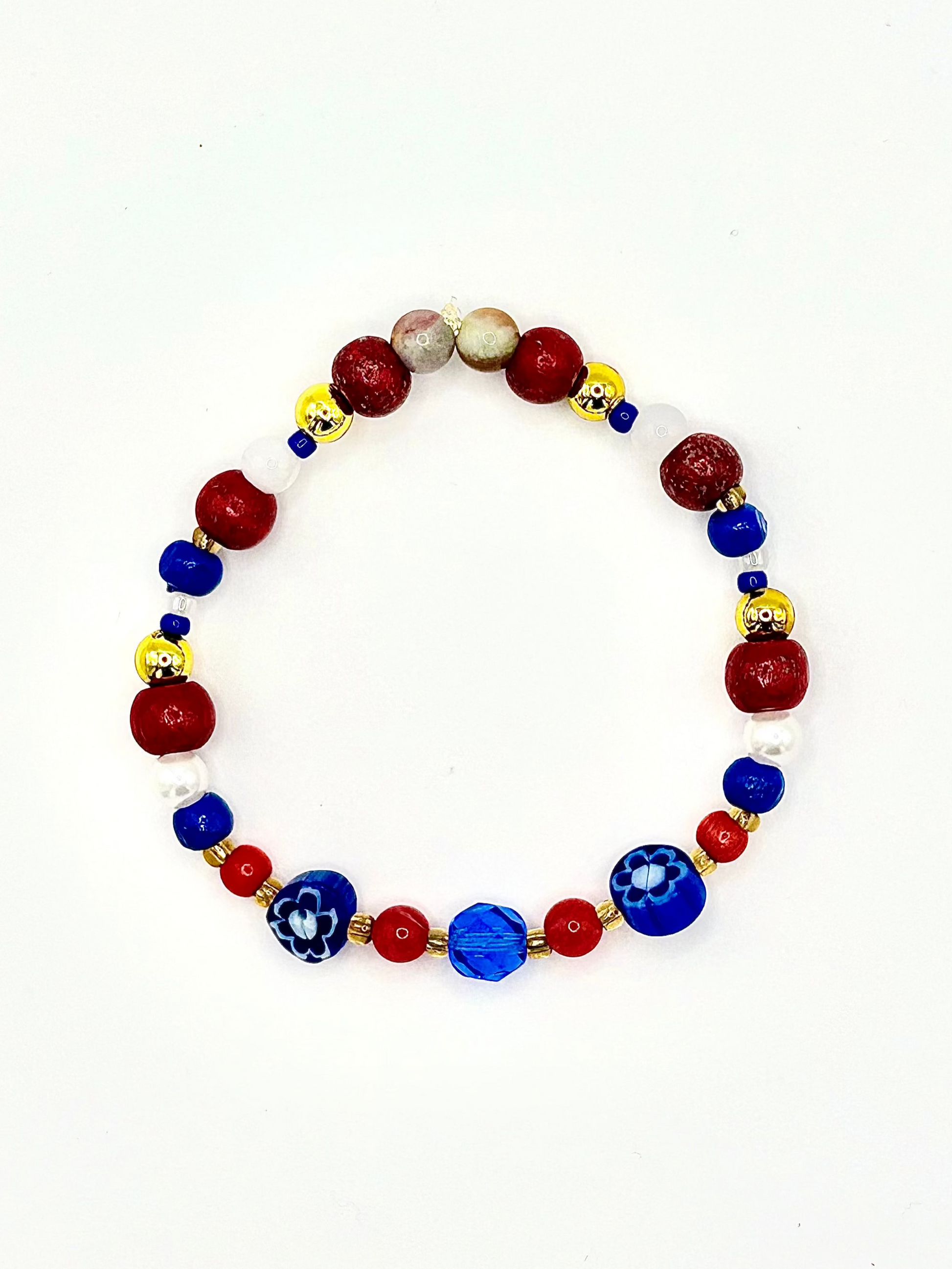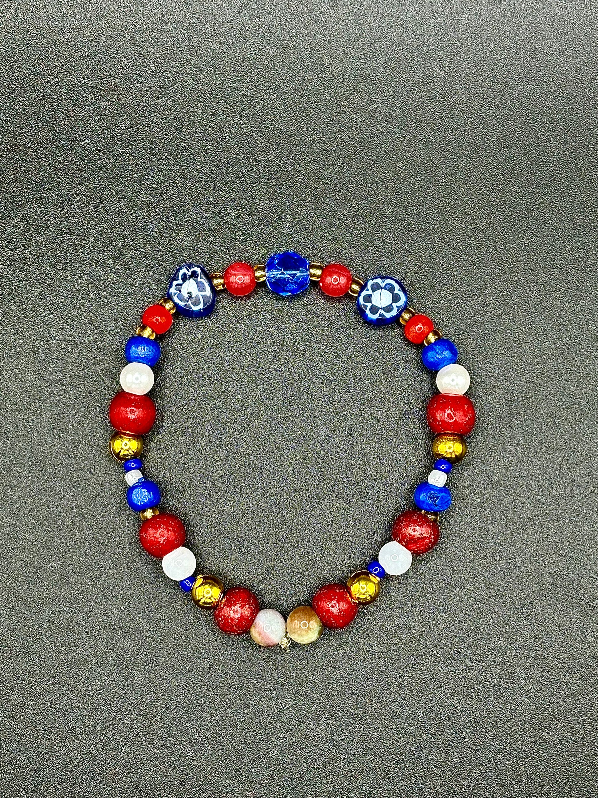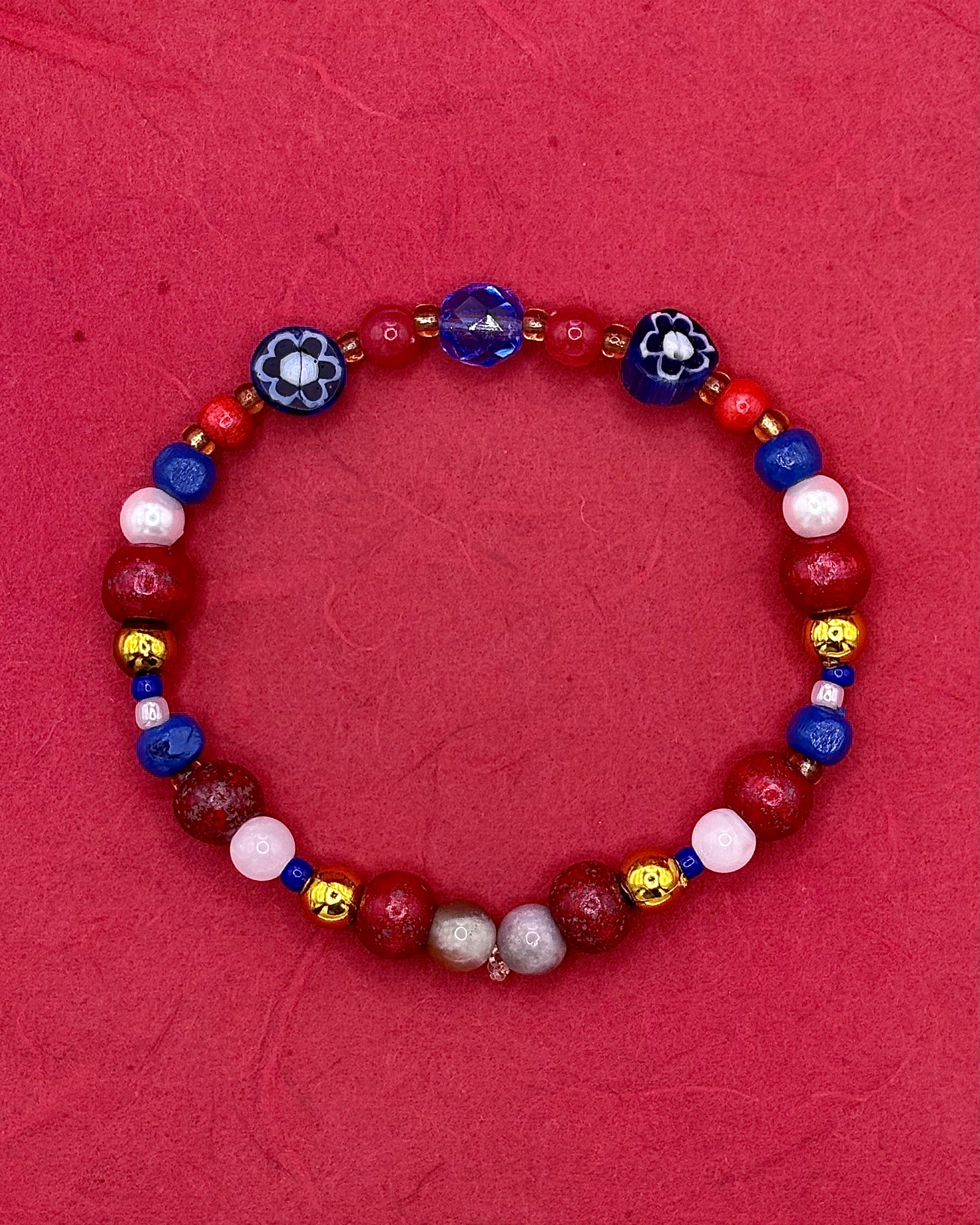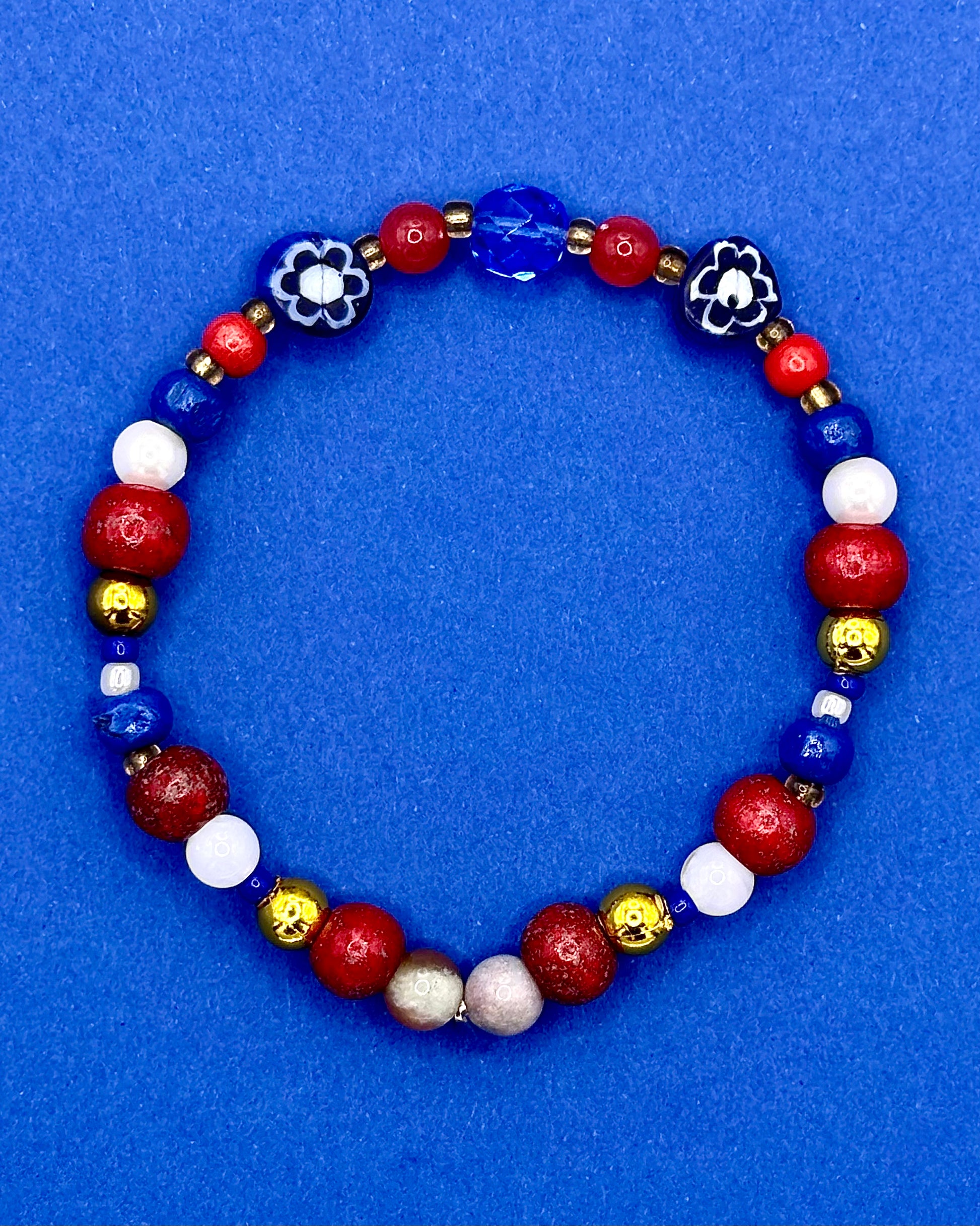 Materials: acrylic, wood and glass beads, elastic nylon thread
