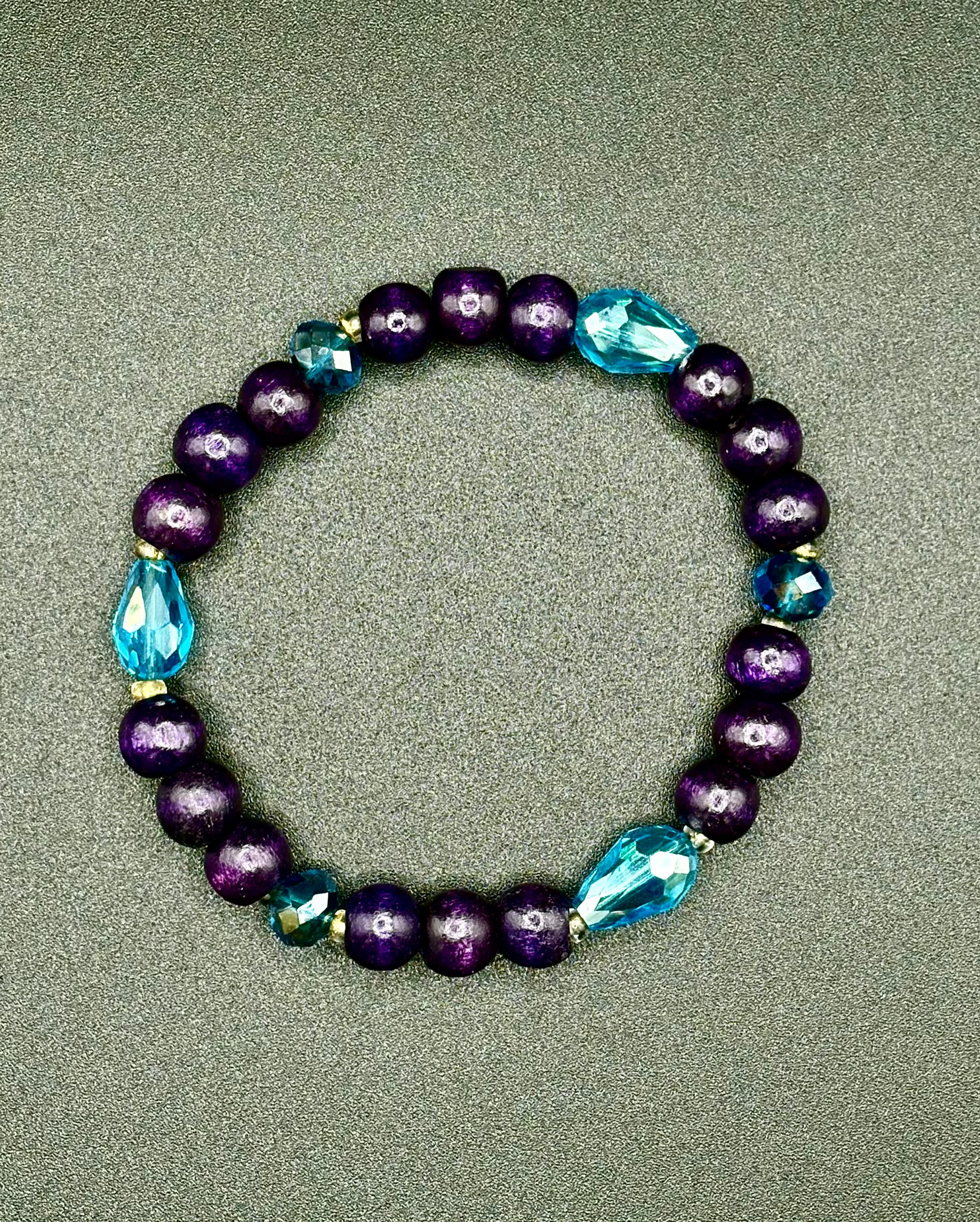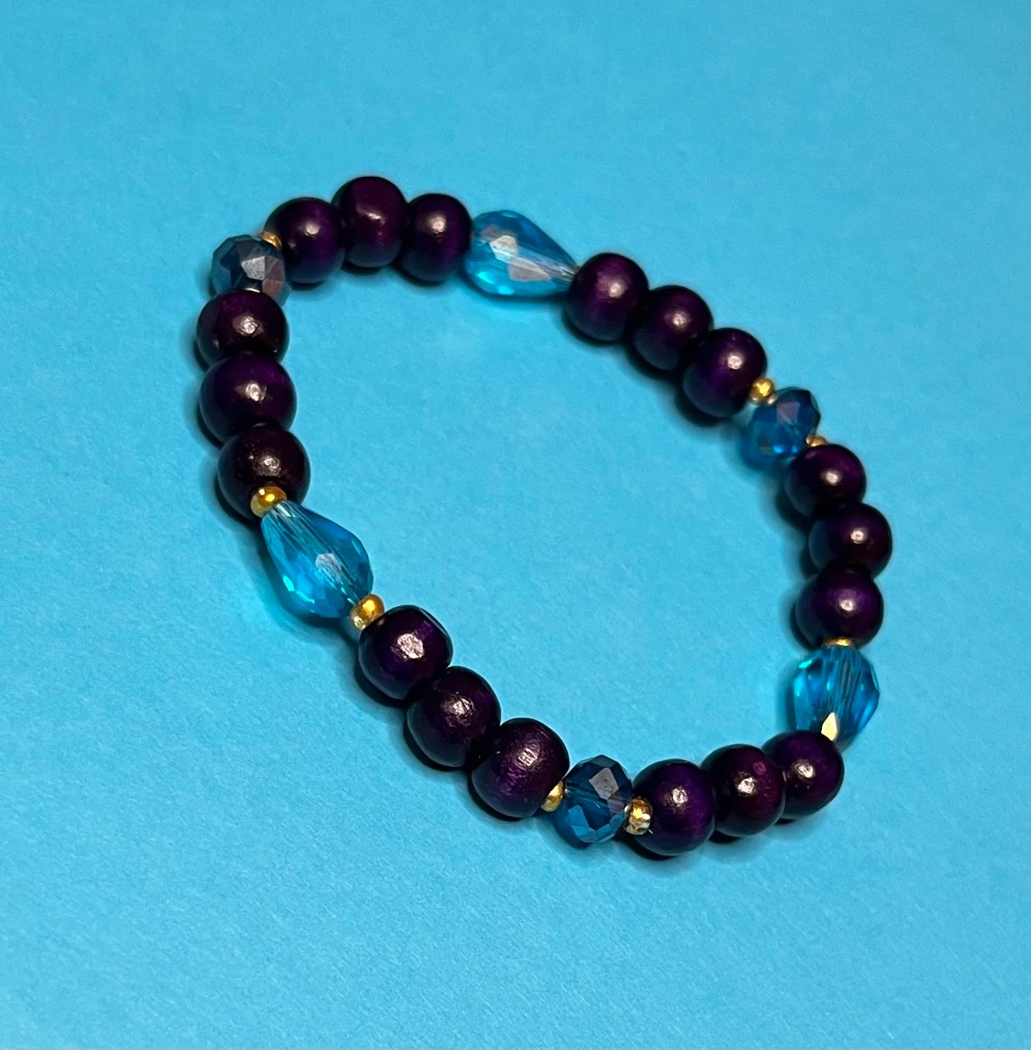 Materials: acrylic, wood and glass beads, elastic nylon thread