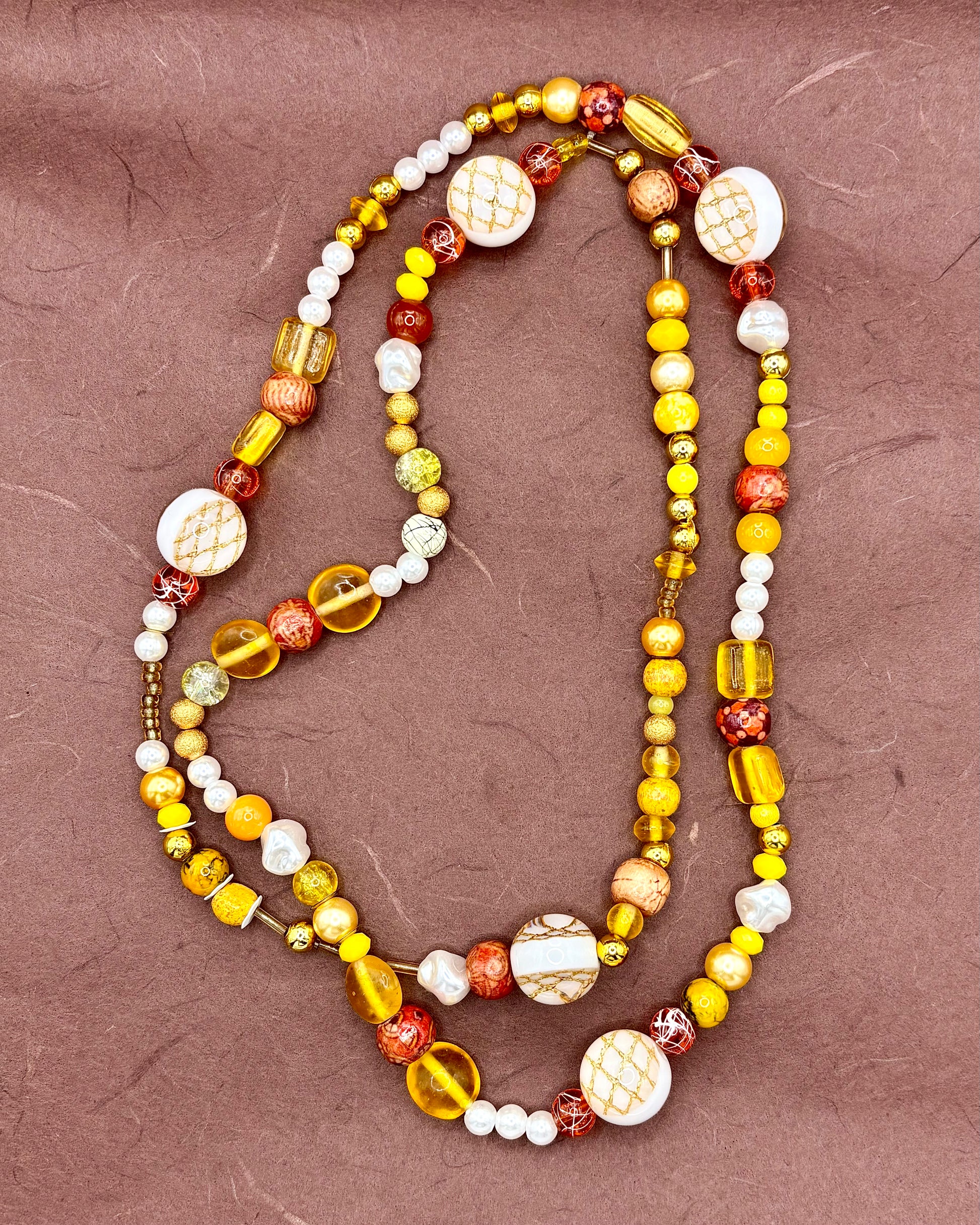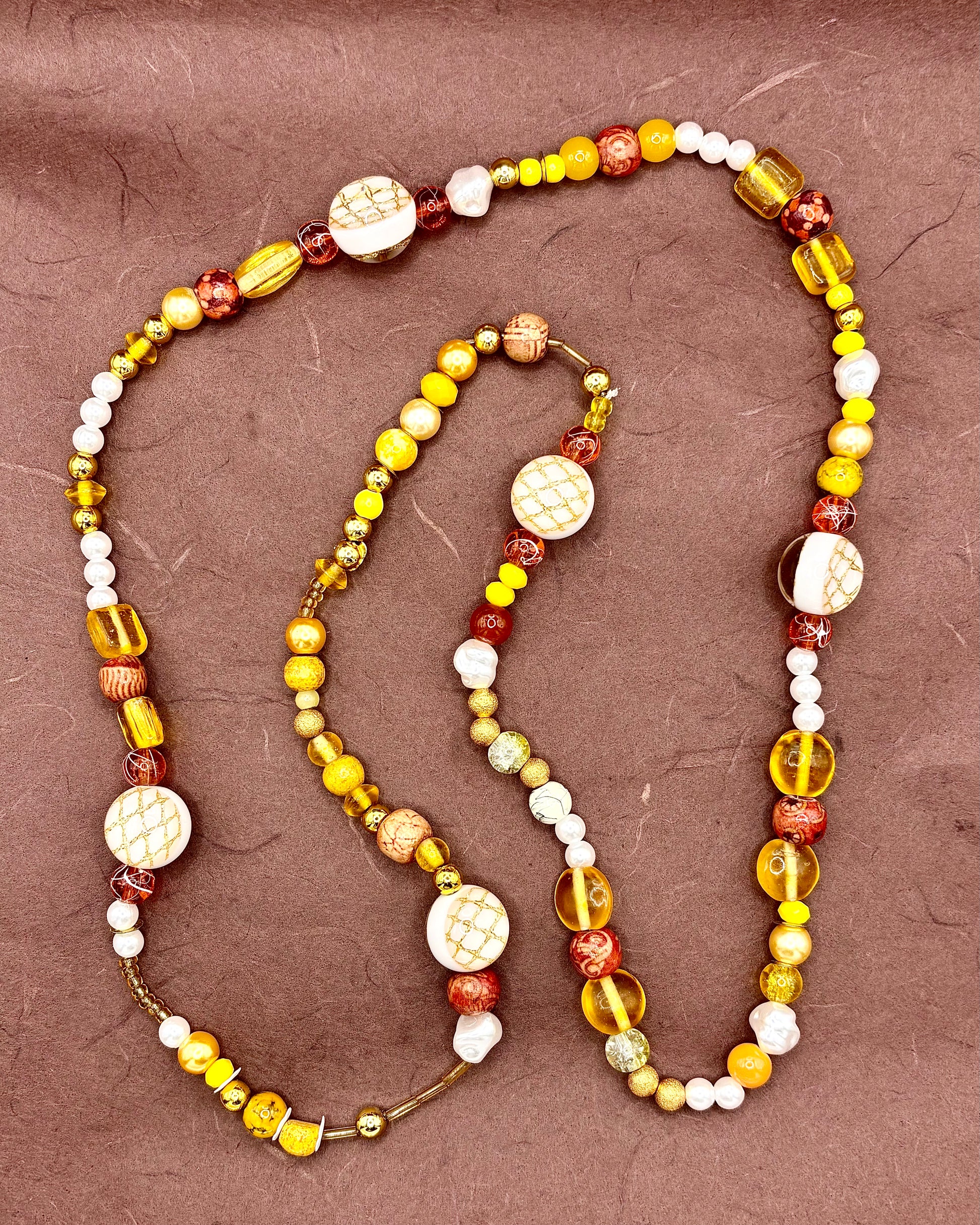 Materials: wood, acrylic, plastic and pearl beads, nylon thread